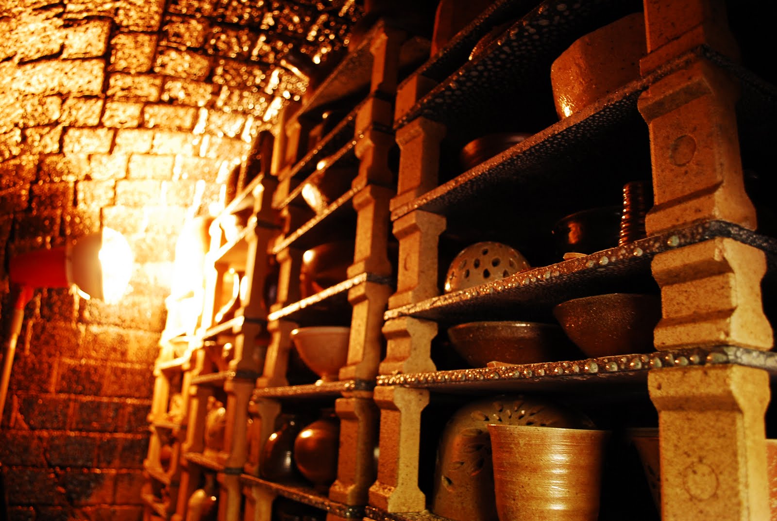 As you can see in this picture the noborigama is great for earthen colors, not so great for anything but. I experimented this time and brought in some blues and yellows and lighter colors but sadly most of my pieces with the lighter colors didn't get fired all the way and will have to be put in the electric kiln anyways. But a few did make it and I didn't care for the result. Looking at everyone elses pieces I noticed the black sandy clay with a white glaze was the most interesting and eye catching. Bizen and Shigaraki clay mostly turned out in brown hues, very subdued. All the glazes in general ended up turning out mild compared to their electric firing process counterparts. (you can also see the earthen color in the photos above) Next noborigama I'll use the black clay and experiment with white glazes. Overall this noborigama was a great learning experience, and I can't wait for the next one this summer!